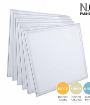 6 Pannelli LED con Flusso Luminoso di 4000lm e Fascio Luminoso 120°. Potenza di 40W. Alta luminosità e rapporto di 100 lm/W. Driver incluso. Montaggio a incasso o superficie. Luce Bianca Naturale 4000K e Fredda 6500K. Dimensioni:595x595x29mm.