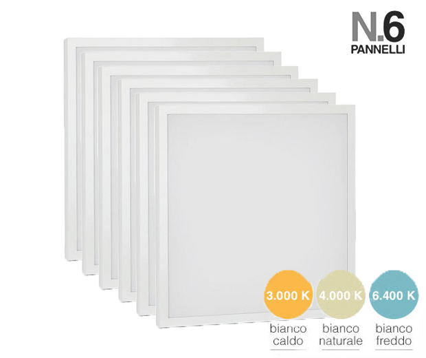 6 Pannelli LED con Flusso Luminoso fino a 3600lm e Fascio Luminoso 120°. Rapporto fino a 120 lm/W. 29W corrispondenti a 150W. Driver incluso. Disponibile con: Luce Bianca Calda 3000K, Naturale 4000K e Fredda 6400K. Dimensioni: 595x595x13mm.